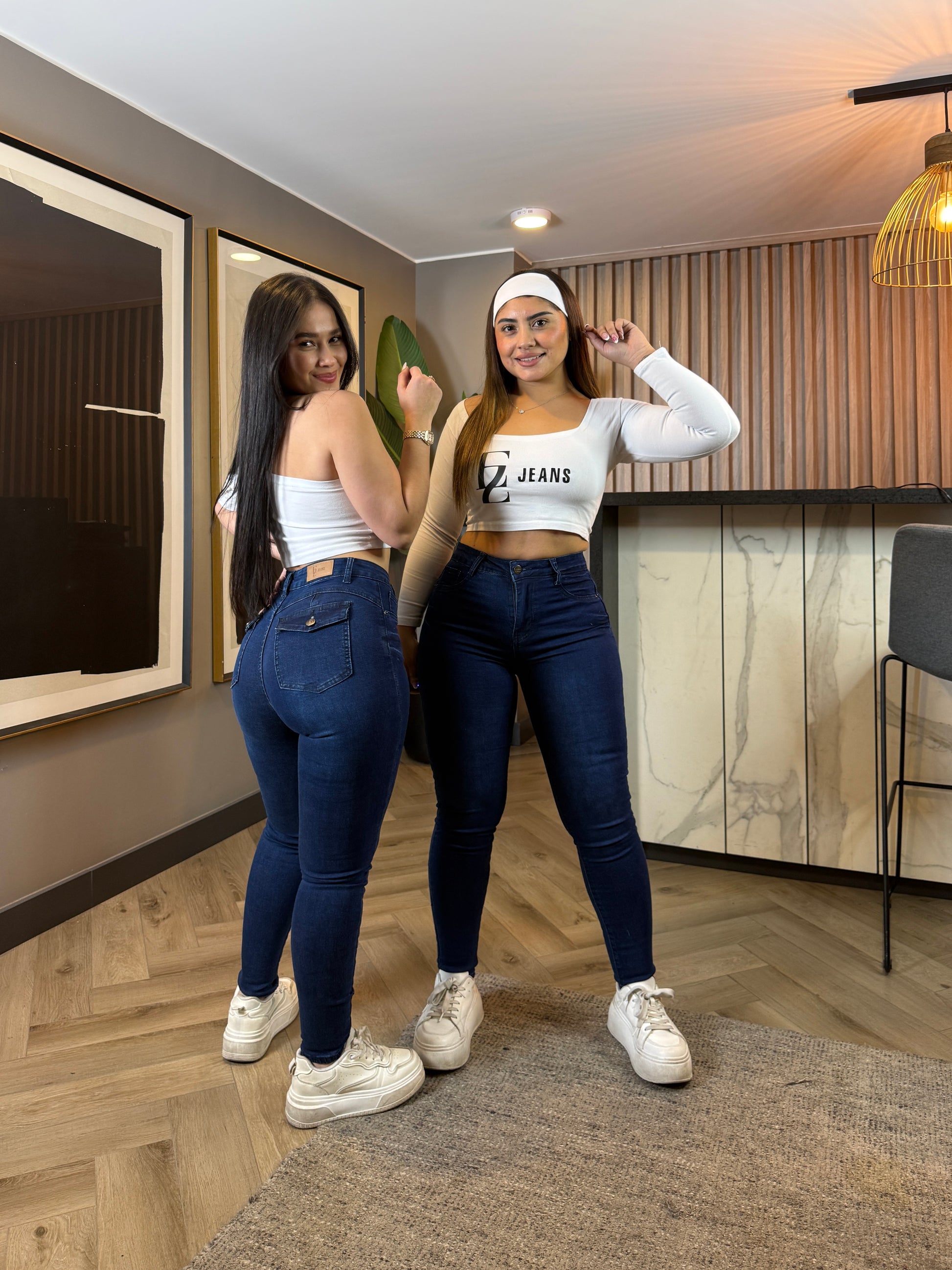 Jeans tipo Skinny color azul con un pequeño focalizado, los bolsillos de atras son con tapa, es tiro alto, elasticado y full push up.