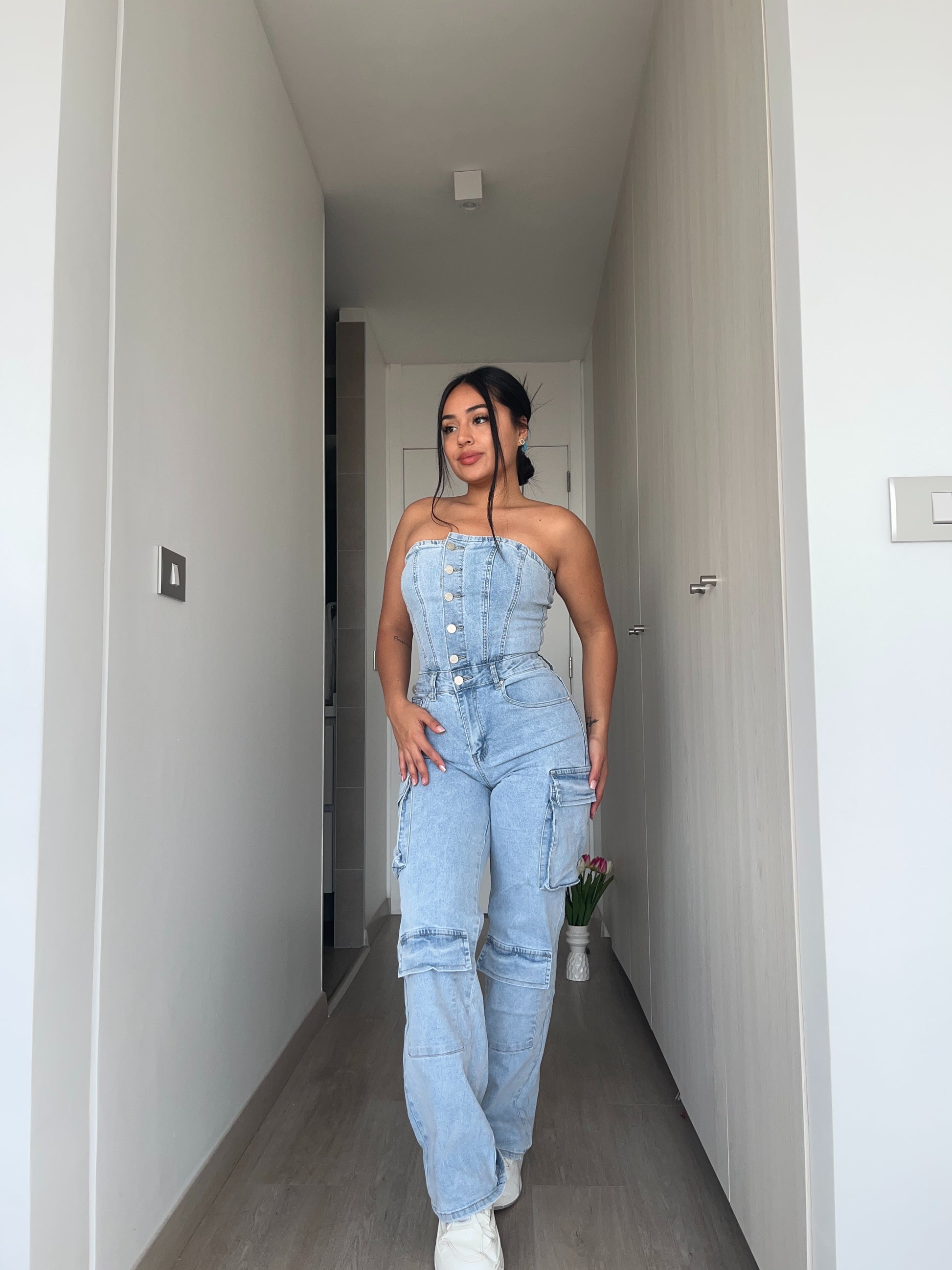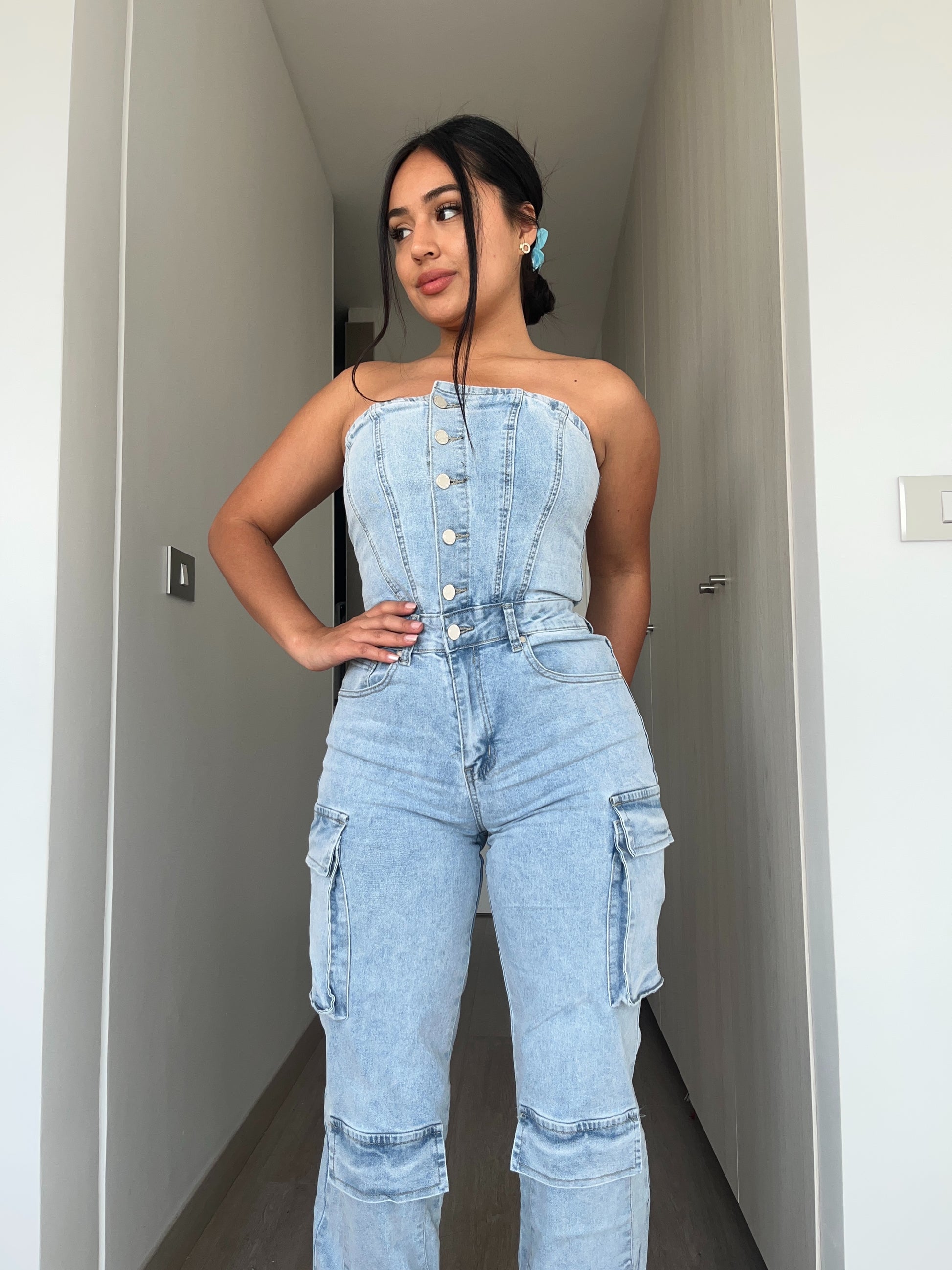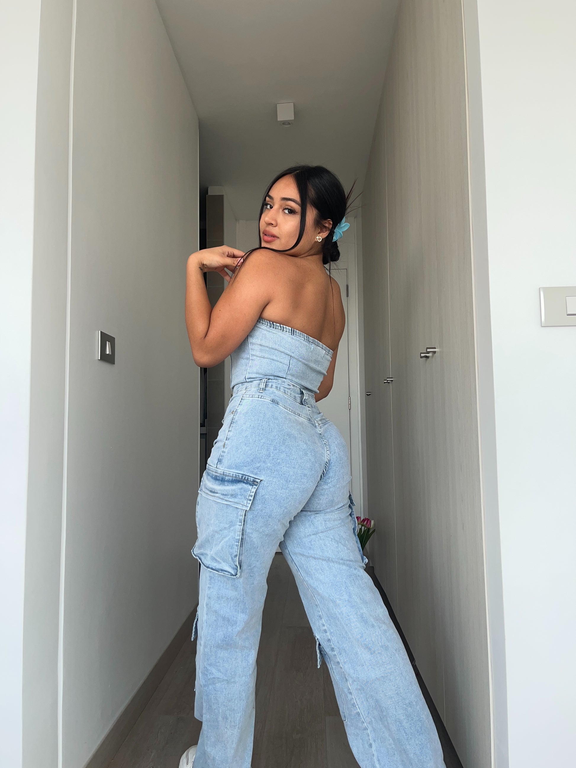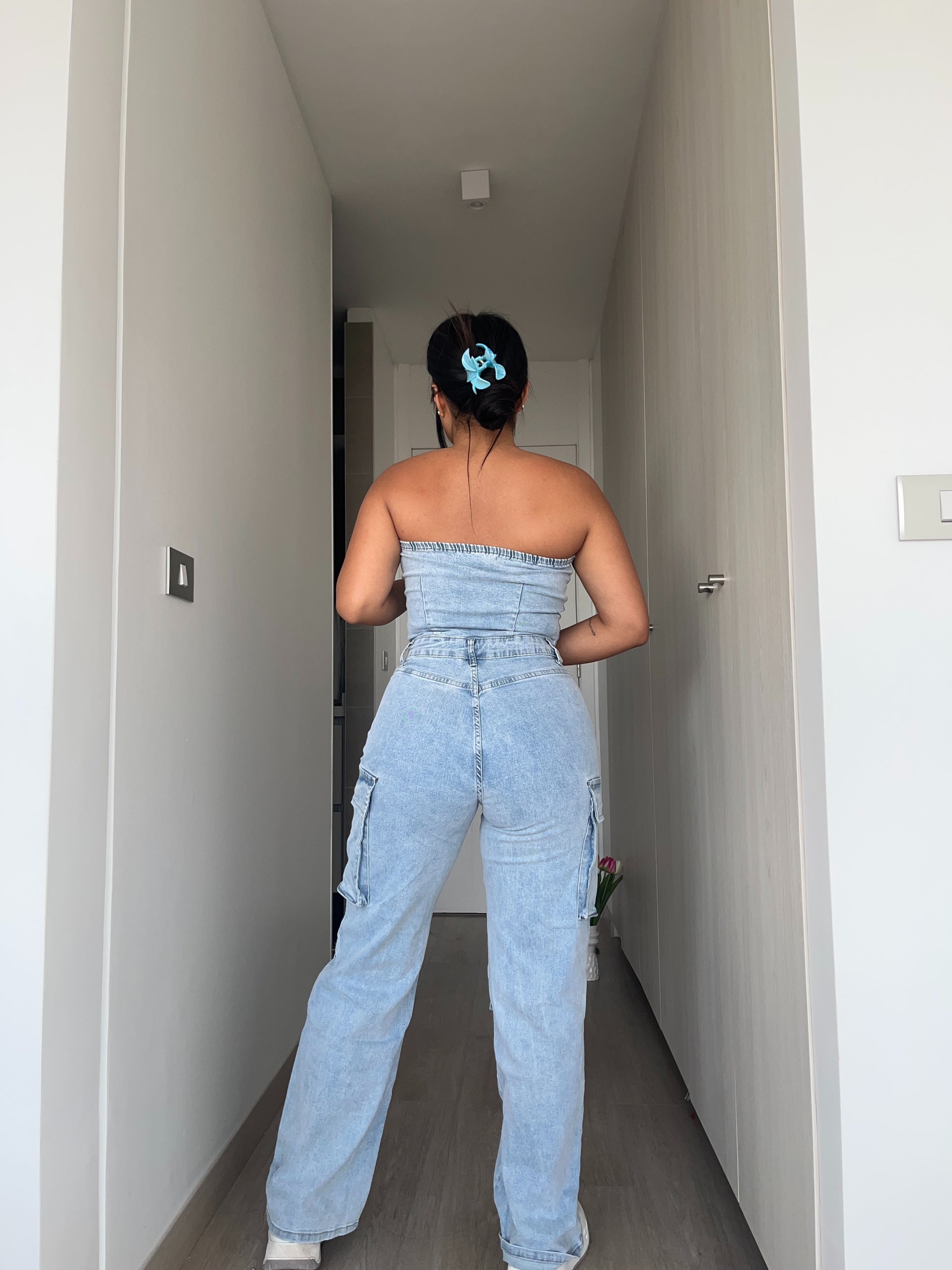 Enetrito largo tipo cargo, color celeste, es elasticado y muy comodo.